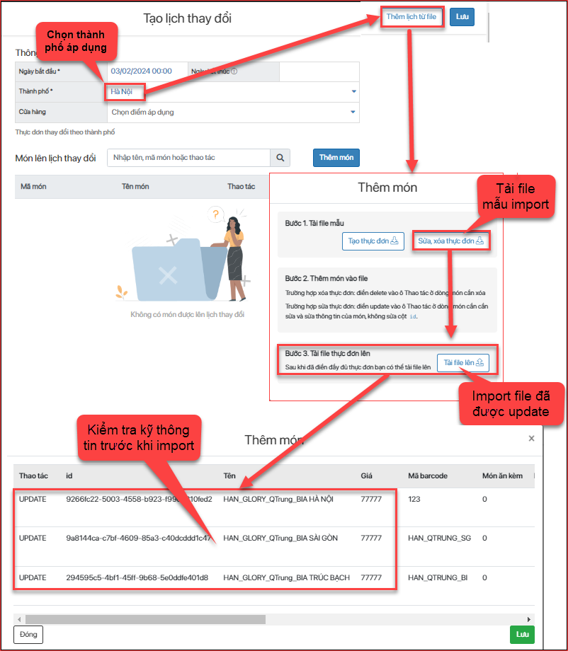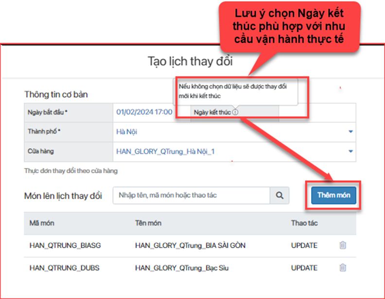 - Bước 2: Tạo lịch thay đổi, lựa chọn tính năng thay đổi “Sửa món” -> Sửa lại đơn giá cần thay đổi