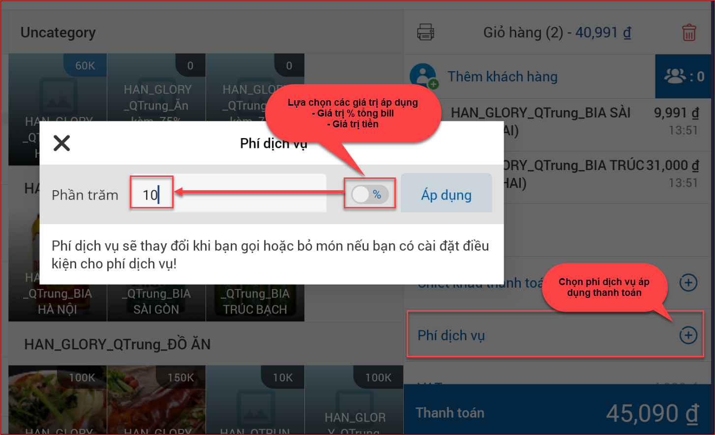 - Bán hàng tại POS: Thao tác nhập giá trị phí dịch vụ trên POS bán hàng