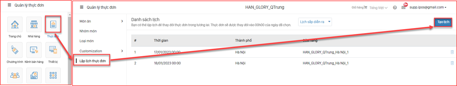 - Bước 1: Chọn “Thực đơn” -> Chọn” Lập lịch thực đơn -> Chọn “Tạo lịch”