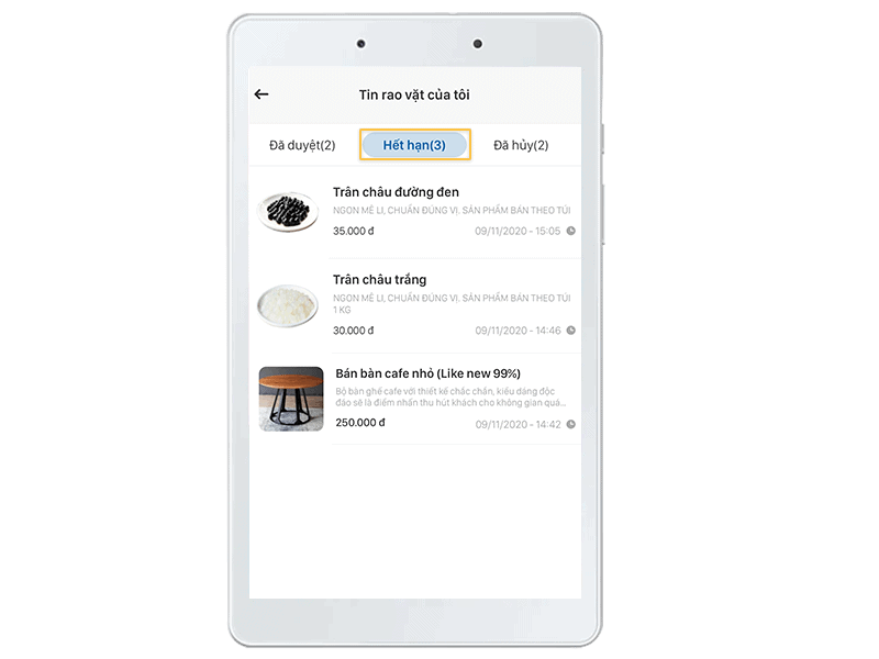 Hết hạn: Mỗi một tin được cho phép hiển thị mặc định trên Tin rao vặt 7 ngày kể từ ngày được duyệt. Hết thời hạn trên tin sẽ tự động chuyển vào mục Hết hạn và không hiển thị trên Tin rao vặt. Muốn đăng lại tin bạn vào chọn tin và chọn Đăng lại tin. Khi đó, tin sẽ tự động đăng lại và hiển thị trong mục Đang bán mà không cần kiểm duyệt lại.