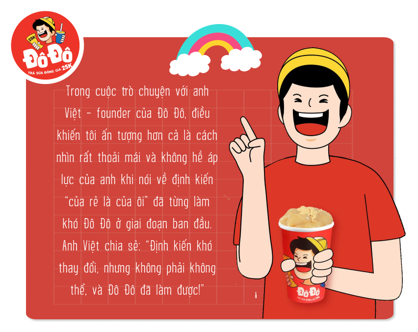 Đúng là từ trước tới giờ chúng ta vẫn thường nghĩ đồ giá rẻ là một cái gì đó không tốt, chất lượng kém hoặc là hàng thải, hàng cận date,... Nhiều khách hàng của Đô Đô trước đây cũng nhìn nhận như vậy. Định kiến mà, rất khó thay đổi trong một sớm một chiều. Nhưng anh cùng toàn bộ nhân sự của Đô Đô đã và đang nỗ lực để mọi người có cái nhìn khác về trà sữa giá rẻ, không phải “của rẻ” nào cũng là “của ôi”.