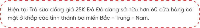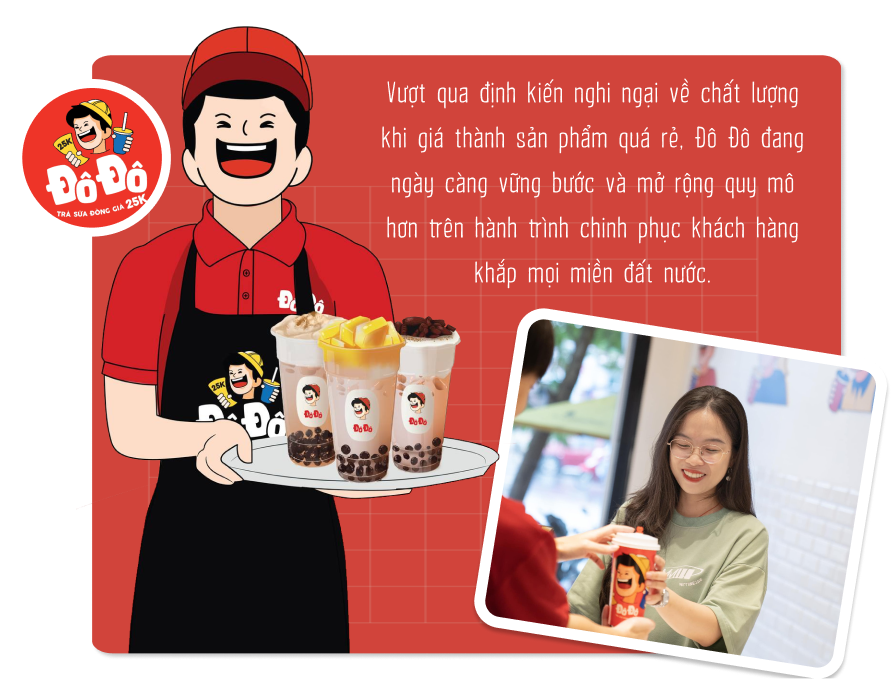 Nổi lên ngay từ thời điểm mới ra mắt, chuỗi trà sữa đồng giá 25K Đô Đô đã nhanh chóng thu hút một lượng lớn khách hàng tới thử vì… tò mò: “Trà sữa đồng giá là tất cả món đều có giá như nhau hả? Lại còn chỉ 25 nghìn nữa, rẻ quá!”. Từ chỗ bị nghi ngại về chất lượng với mức giá bình dân như vậy, đến nay Đô Đô đã dùng 3 năm nỗ lực phát triển để chứng minh cho khách hàng biết: Thương hiệu có tâm - có tầm - có sản phẩm đạt chuẩn đáp ứng đầy đủ các tiêu chí vệ sinh - an toàn thực phẩm.