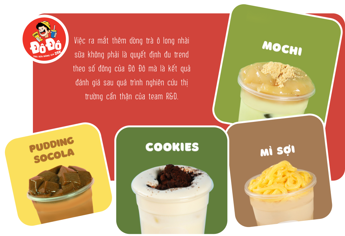 Đô Đô vừa ra mắt trà ô long nhài sữa và nhận được phản ứng rất tích cực từ phía khách hàng. Đây không phải là quyết định “đu trend” đơn thuần mà là kết quả đánh giá sau quá trình nghiên cứu thị trường vừa rồi của team R&D Đô Đô. Trà đậm vị có tiềm năng rất lớn để đi đường dài với các đặc điểm như có mùi trà thơm tự nhiên, hương trà nguyên bản hơi chát nhẹ, không bị cảm giác công nghiệp như nhiều dòng trà sữa ngọt đậm khác.