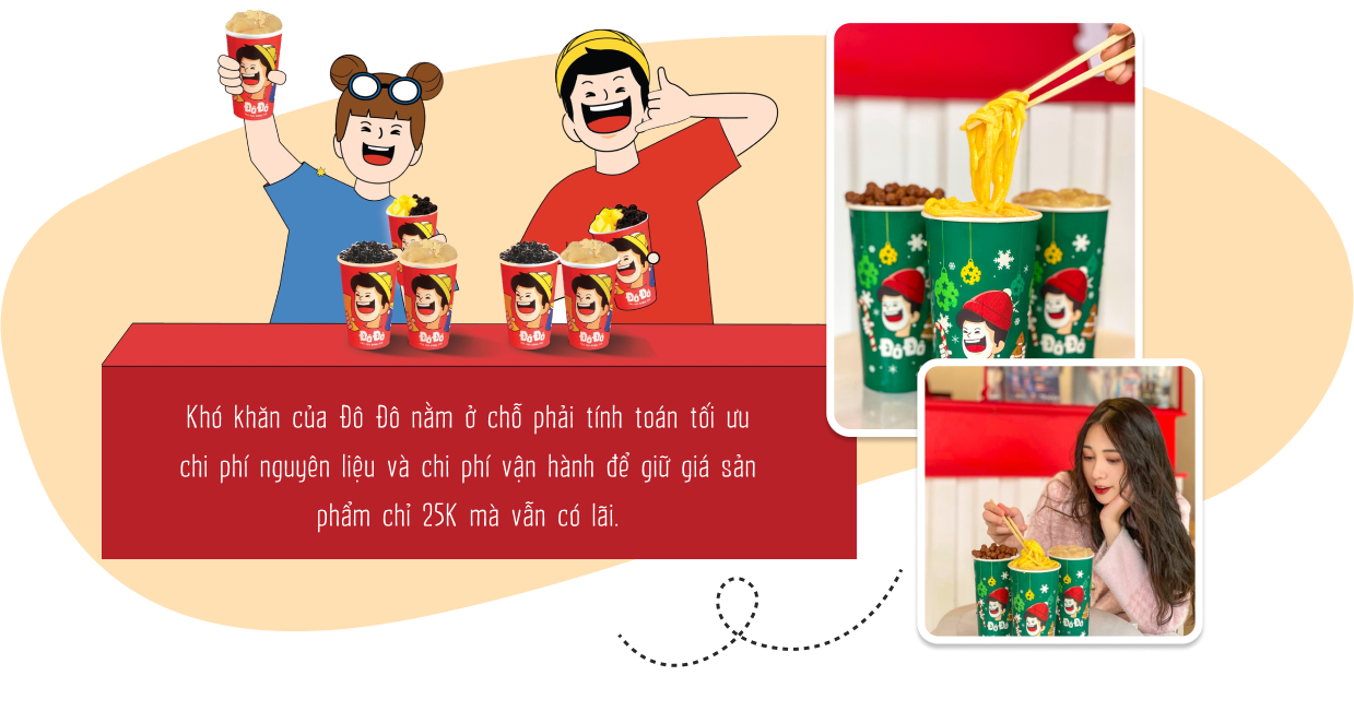 Khi triển khai mô hình đồng giá 25K, vấn đề lớn nhất anh phải đối mặt là chi phí nguyên liệu, làm sao để mình vẫn nhập về được nguồn nguyên liệu chất lượng tạo nên sản phẩm tốt, đồng thời lại tính toán chi phí để bán một cốc trà sữa giá 25K mà vẫn lãi. Điều này không hề dễ dàng chút nào, nhất là trong bối cảnh mọi hàng hóa đều tăng giá thì việc giữ cho sản phẩm vẫn “ngon - bổ - rẻ” là thách thức đối với bất kỳ người làm chủ nào. Đội ngũ R&D của Đô Đô đã phải nghiên cứu rất kỹ về công thức pha chế nhằm tối ưu chi phí nguyên liệu mà vẫn đáp ứng khẩu vị của khách hàng.