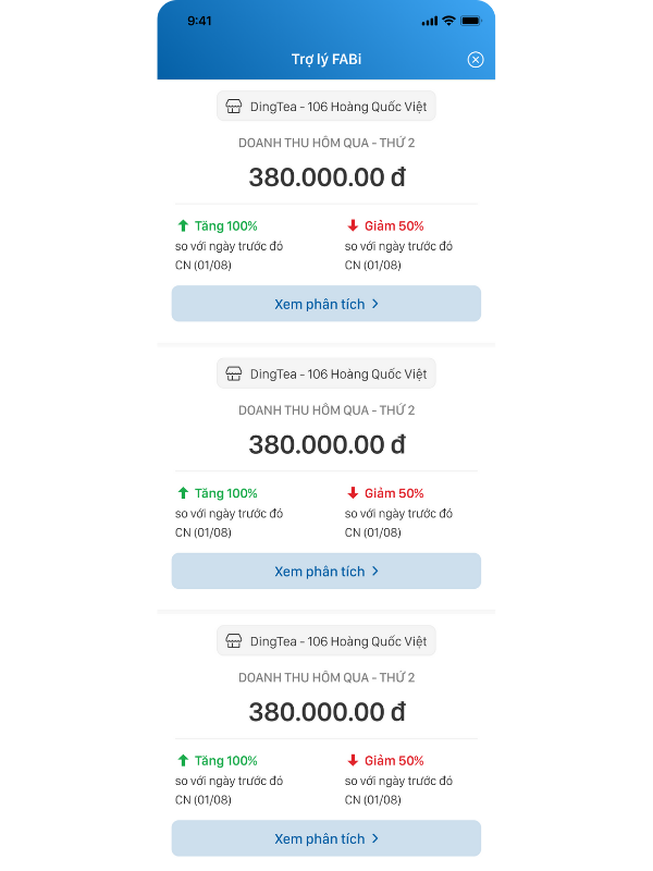 Bên cạnh đó, chủ nhà hàng/cafe còn nhận được sự trợ giúp của trợ lý ảo FABi trong việc phân tích dữ liệu chuyên sâu để đưa ra những nhận định chính xác về tình hình kinh doanh hiện tại và gợi ý những giải pháp để vận hành cửa hàng tốt hơn. Trợ lý ảo FABi sẽ dựa vào sự hiểu biết về thị trường để phân tích doanh thu qua các tiêu chí khác nhau.
