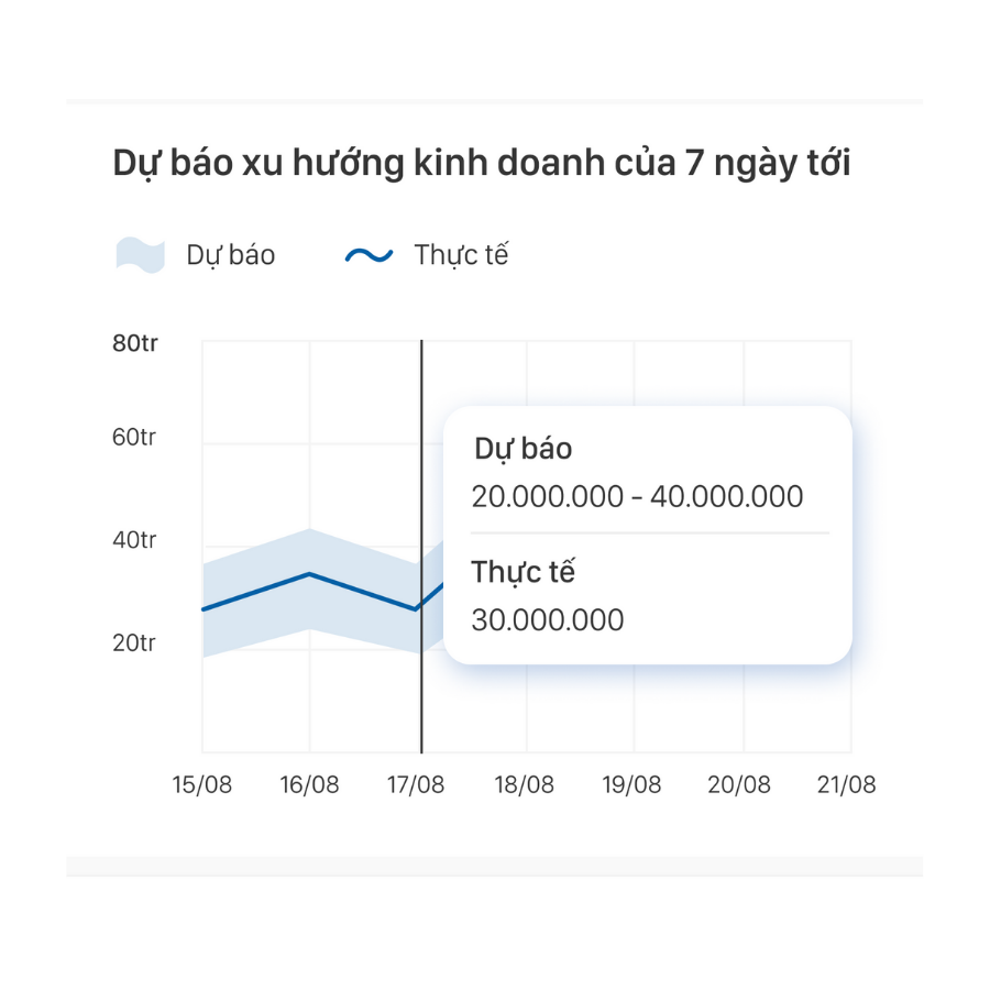 Dựa trên dữ liệu bán hàng của người dùng kết hợp với các chỉ số của thị trường, Trợ lý ảo FABi sẽ thực hiện nghiên cứu và đưa ra dự báo về doanh thu trong 1 tuần kế tiếp. Chủ nhà hàng/cafe sẽ có gợi ý về mục tiêu doanh thu để có thể đưa ra phương án cải thiện và tối ưu tình hình kinh doanh nhằm đạt được những kết quả tốt hơn. Bên cạnh đó, việc so sánh doanh thu dự báo và thực tế cũng là một cách để đánh giá năng lực vận hành kinh doanh của cửa hàng.