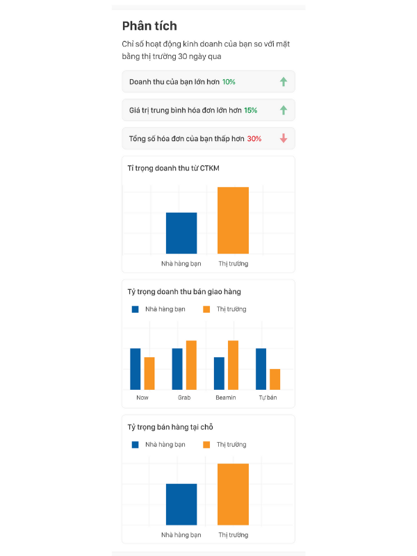 – Tỷ trọng doanh thu bán giao hàng: Thị trường đang bán đồ ăn online qua các kênh của bên thứ 3 như Grab, ShopeeFood, Baemin rất mạnh, mình có nên đi theo xu hướng này để gia tăng doanh thu? Hay nên đẩy mạnh kênh tự bán để không phải trích chiết khấu hoa hồng và bảo toàn doanh thu?…