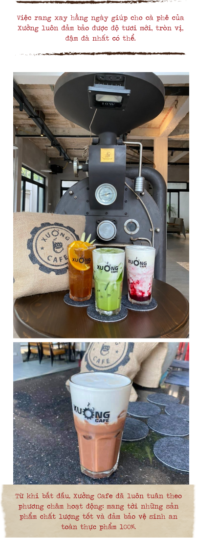 Anh chị muốn khách hàng nhớ tới Xưởng Cafe không chỉ là một điểm đến để thưởng thức cà phê đơn thuần mà còn như một “Công Xưởng” thực thụ, có thể vừa rang, vừa xay, vừa pha chế cà phê. Ở những cơ sở đầu tiên, thậm chí anh chị còn đặt cả những chiếc máy rang, xay cà phê để khách đến quán được theo dõi quá trình từ lúc chế biến hạt đến khi ra được thành phẩm là ly cà phê tới tay khách như thế nào.